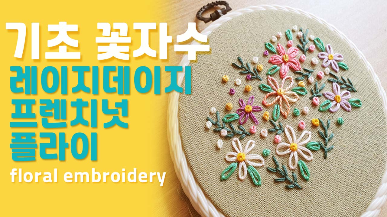 레이지데이지 스티치,프렌치넛스티치,플라이스티치 이렇게 3가지 스티치로 만들어 본 기초 꽃자수 입니다.