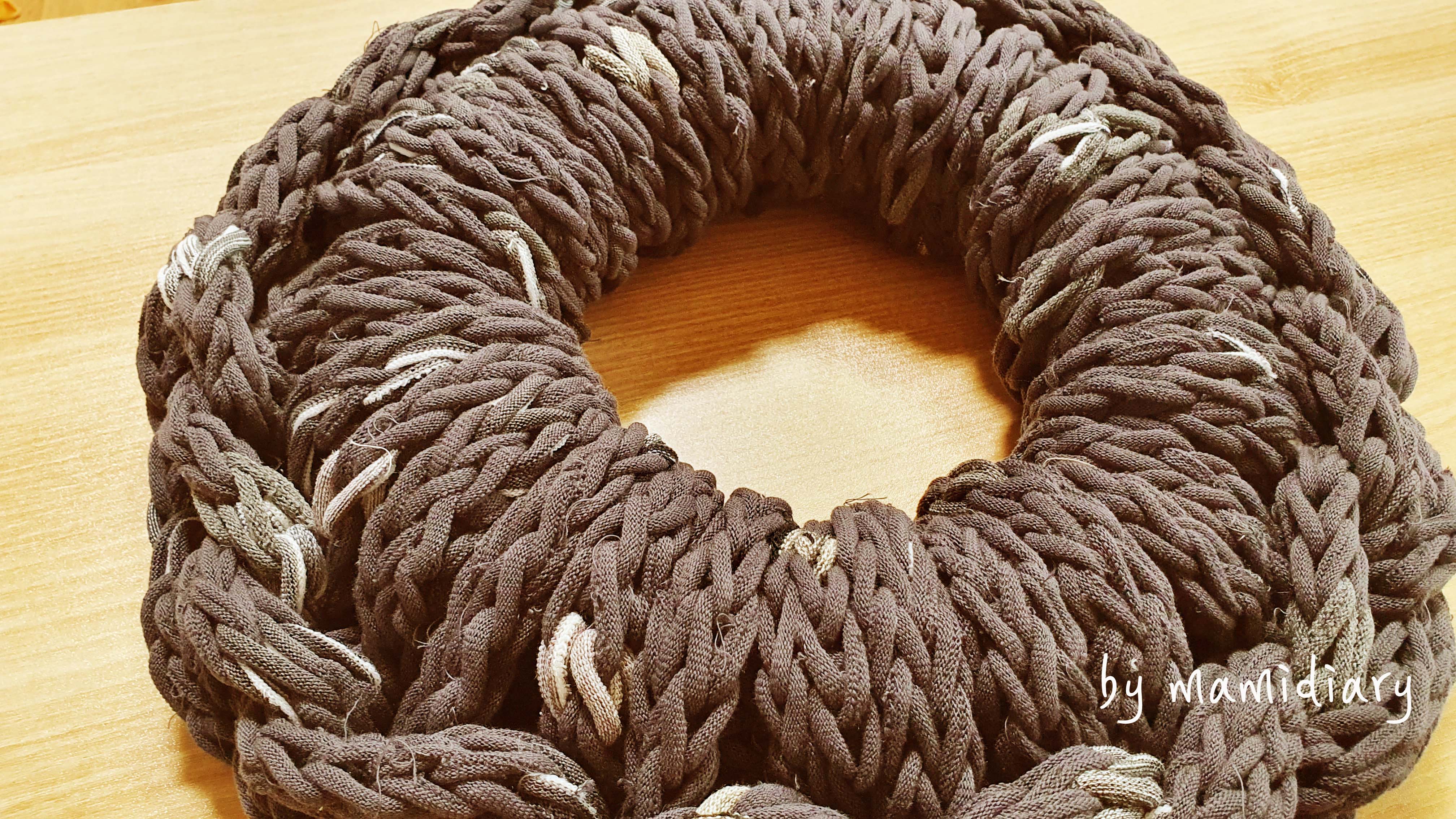이것을 실로 삼아서 코바늘로 원형뜨기 하는 방식으로 도넛방석을 만들어 봤습니다.
